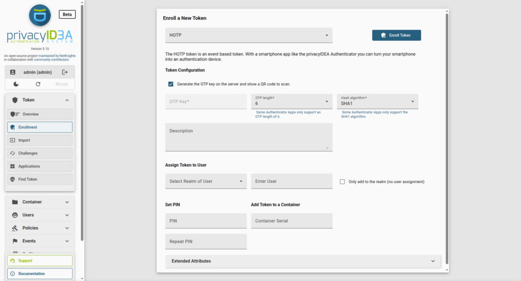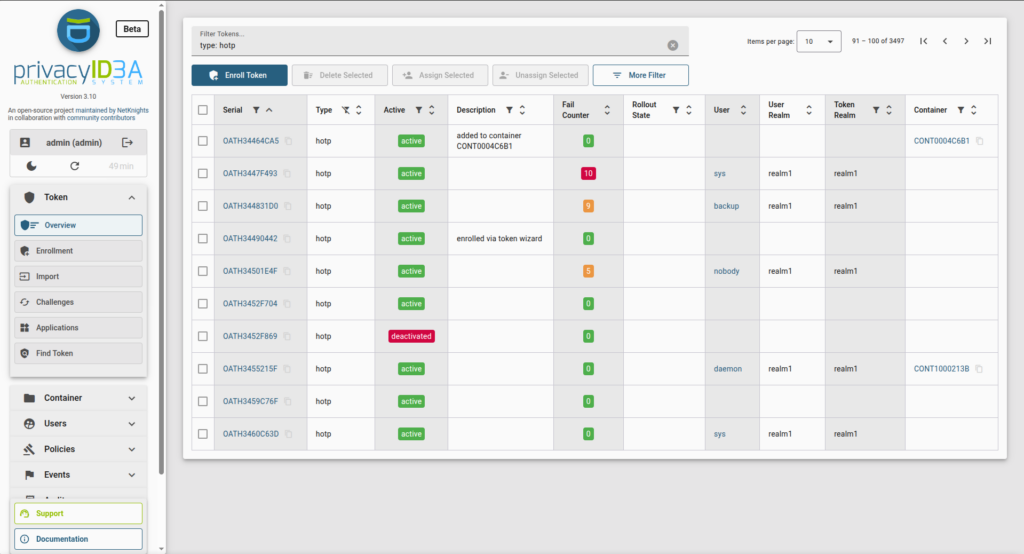 The modernized user interface of privacyIDEA is now available in its full functionality as a beta version. In addition to the existing self-service area, it also includes the administrator view. In version 3.13, however, the previous WebUI remains the default interface. Users can test the new user interface and provide feedback. In version 3.14, the new WebUI will then be activated as the default interface.